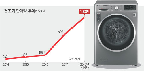 16일 가전업계에 따르면 올해 건조기 판매량이 100만대를 넘어설 것으로 예상된다. 2014년 불과 5만대에 그쳤던 건조기 판매량이 4년 만에 20배가량 늘어난 셈이다.