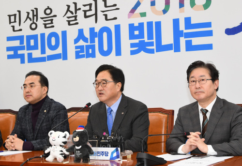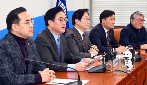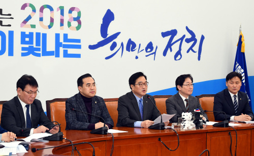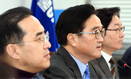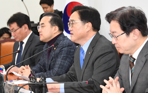 | 24일 국회에서열린 더불어민주당 원내대책회의에서 우원식 원내대표가 발언을 하고있다.서상배 선임기자 |