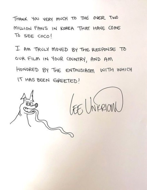 언크리치 감독은 자필 편지(바로 아래 사진)에서 “'코코'가 한국에서 200만 관객을 돌파해 매우 감사하다"며 "한국에서 진정성이 통했다고 생각된다”고 말했다.