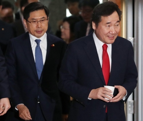 | 이낙연 국무총리(오른쪽)이 25일 정부서울청사에서 법무부 등의 신년 업무계획 보고를 받기 위해 박상기 법무장관(왼쪽) 등과 함께 회의실로 이동하고 있다. 세계일보 자료사진 |