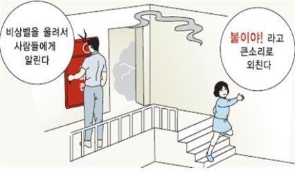 불이 나면 침착하고 신속하게 현장에서 대피해야 한다. 불을 발견하면 '불이야'라고 큰소리로 외치고 화재경보 비상벨을 눌러 다른 사람에게 화재 사실을 알리면서 가장 가까운 비상구를 찾는다.