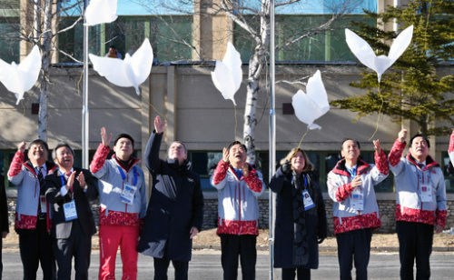| 비둘기 풍선에 ‘평화올림픽’ 염원 담아… 토마스 바흐 IOC 위원장(왼쪽 네번째)과 이희범 평창동계올림픽 조직위원장(〃 다섯 번째) 등이 1일 강원도 평창올림픽선수촌에서 열린 개촌식에서 비둘기 모양의 풍선을 날리고 있다. 평창=남정탁 기자 |