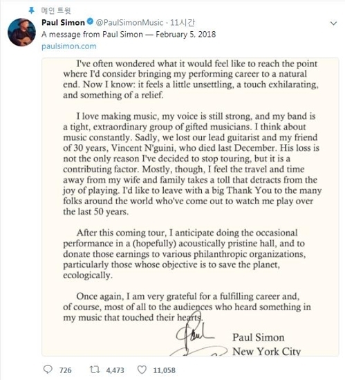 폴 사이먼은 5일(현지시간) 자신의 트위터를 통해 성명을 내고 "내 음악에서 무엇인가를 들어준 관객들에게 감사하다"며 다가올 공연을 마지막으로 투어 공연을 중단한다고 밝혔다.