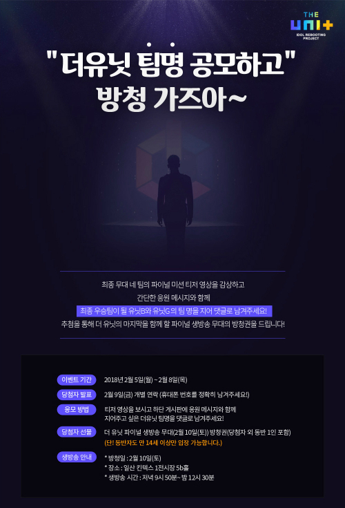 이번 이벤트는 ‘더유닛’ 공식 홈페이지(http://theunit.kbs.co.kr/event/event_9.html)를 통해 참여 가능하며 유닛B와 유닛G 36인의 파이널 미션 티저 영상을 보고 응원 메시지와 함게 지어주고 싶은 팀명을 댓글로 남기면 된다. 이렇게 유닛 메이커들에게 공모 받은 팀명을 토대로 향후 최종 팀명을 발표한다.