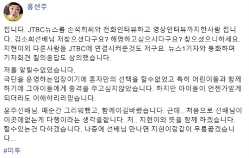 지난 21일 홍선주는 당시 익명으로 폭로한 이가 자신임을 페이스북에 공개하며 글말미에 "윤주 선배님. 매순간 그리워했고, 함께이길 바랐다. 근데 처음으로 선배님이 이곳에 없는 게 다행이라는 생각을 한다. 저 지현이와 뜻을 함께 하겠다. 할 수 있는 건 다 하겠다. 나중에 선배님 만나면 지현이랑 같이 무릎 꿇겠다"고 고 이윤주에게 전하는 메시지를 덧붙여 이윤주가 누구인지 궁금증을 자아냈다.