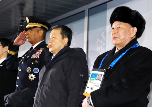 | 김영철 옆 브룩스 빈센트 브룩스 한·미연합군사령관(왼쪽부터)이 평창동계올림픽 폐회식에서 이진성 헌법재판소장, 김영철 조선노동당 중앙위 부위원장과 나란히 서서 국민의례 중 거수경례를 하고 있다. 평창=연합뉴스 |