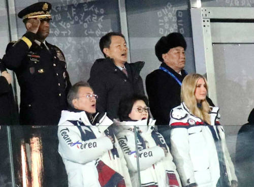 | 폐회식의 南·北·美 VIP 문재인 대통령과 김정숙 여사가 25일 강원 평창군 올림픽스타디움에서 열린 평창동계올림픽 폐회식에서 애국가를 부르고 있다. 앞줄 왼쪽부터 문 대통령 내외, 이방카 트럼프 미국 백악관 선임고문. 뒷줄 왼쪽부터 빈센트 브룩스 한미연합군사령관, 이진성 헌법재판소장, 김영철 조선노동당 중앙위 부위원장(당 통일전선부장). 평창=남정탁 기자 |