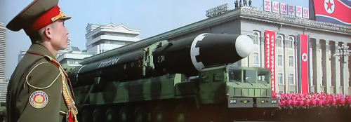 | 北 건군절에 등장한 화성-15 북한의 건군절 70주년인 지난달 8일 평양 김일성광장에서 개최된 열병식에 등장한 화성-15 모습. 북한은 지난해 11월 대륙간탄도미사일(ICBM)급 화성-15를 한 차례 시험발사했다. 세계일보 자료사진 |
