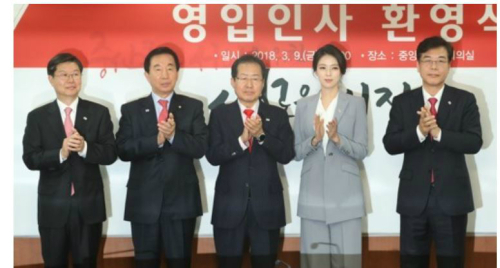 | 9일 한국당의 영입인사 환영식, 왼쪽부터 길환영 전 KBS 사장, 김성태 원내대표, 홍준표 대표, 배현진 전 MBC 아나운서, 송언석 전 기재부 2차관. 사진=연합뉴스 |