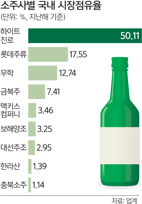소주를 즐기는 국민 2명 중 1명이 하이트진로의 ‘참이슬’을 마신 셈이다. 특히 주류 대기업인 하이트진로와 롯데주류가 전체 소주 판매량의 70가량을 차지해 사실상 국내 소주시장을 장악하면서 지방 소주사들이 경영난을 겪고 있다.