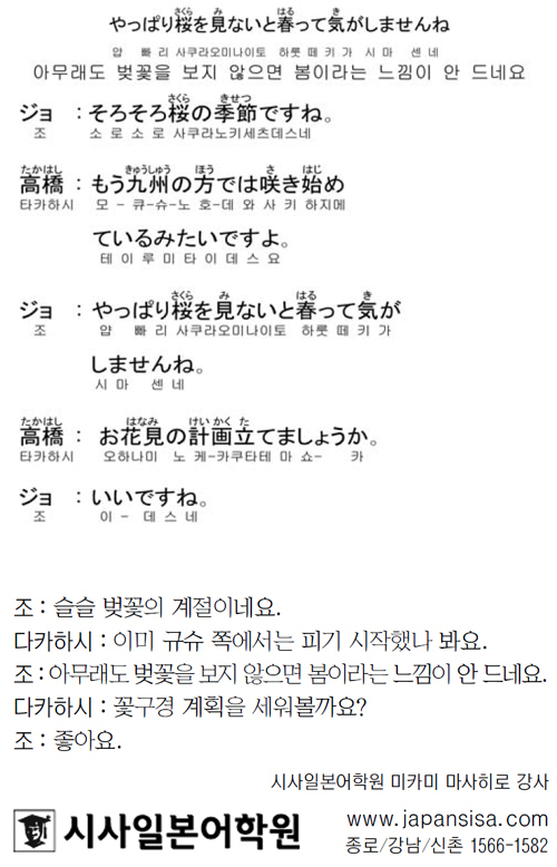 [시사일본어학원의 초단기 일본어 회화] 아무래도 벚꽃을 보지 않으면 봄이라는 느낌이 안 드네요 입력 : 2018-03-11 19:41:49 수정 : 2018-03-11 19:41:49 구글 네이버 유튜브 Copyright ⓒ 세계일보. 무단 전재 및 재배포 금지 세계일보
