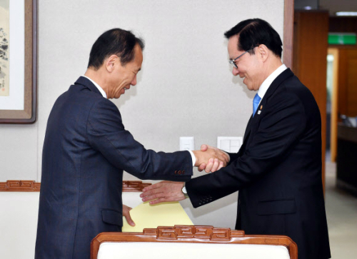 | 12일 최문순(왼쪽) 강원도 지사는 송영무 국방부 장관을 찾아가 강원도 등 접경지역 군 장병들의 외출 외박시 위수지역 제한 규정 철폐 방침이 시행되면 많은 지역민들이 고통을 받게 된다며 재고를 요청, 만족할 만한 답을 얻어 냈다. 사진=연합뉴스 |
