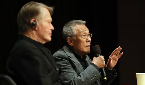 | 지난 12일 서울 종로구 광화문 교보빌딩에서 열린 특별대담에서 소설가 황석영(오른쪽)이 발언하고 있다. 연합뉴스 |