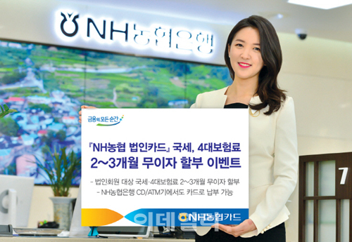 NH농협카드(사진)가 법인카드(개인사업자 포함)로 국세 및 4대 사회보험료 납부 시 2~3개월 무이자할부 이벤트를 오는 6월 말까지 실시한다. 지난해 12월 말부터 자동화기기(CD·ATM)에서 카드로 국세 납부가 가능해짐에 따라 인터넷 사용 및 세무서 방문이 어려웠던 납세자들은 전국 농협은행 CD·ATM기를 이용해 편리하게 납부할 수 있다. 국세 납부대상은 △3월 법인세 △4월 부가가치세 △5월 종합소득세 등이며 4대 사회보험료는 △국민연금 △건강보험 △산재보험 △고용보험료로 매월 상시 납부 가능하다.