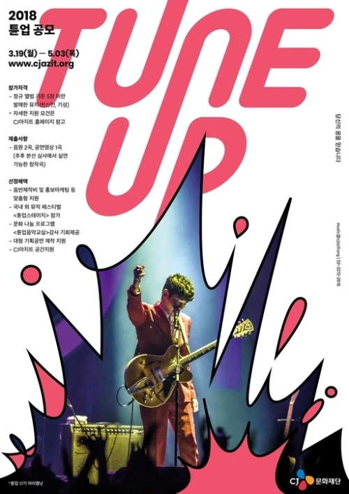 음악부문 지원사업 ‘튠업’(사진)은 5월 3일까지 19기 뮤지션을 모집한다. CJ아지트 홈페이지에 지원서 양식을 작성하고 음원을 제출하면 온라인 심사, 본선 실연 심사와 심화 인터뷰를 거쳐 6월 최종 선정자(팀)를 가려낸다. 정규 앨범 기준 5장 미만 발매 뮤지션, 타 유사 선정 프로그램에 뽑히지 않은 뮤지션이라면 음악 장르에 상관없이 누구나 지원이 가능하다. 음반 제작비 및 홍보·마케팅 영상 제작 등 맞춤형 지원, 국내외 뮤직 페스티벌 내 ‘튠업스테이지’ 참여 기회, 문화 나눔 프로그램 ‘튠업음악교실’ 강사 참여 기회와 소정의 활동비, 협의를 통한 대형 기획공연 제작지원 등의 혜택이 제공된다.