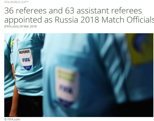 30일 국제축구연맹(FIFA)은 홈페이지를 통해 2018 러시아 월드컵에서 활약할 심판진 99명(주심 36명·부심 63명)을 확정해서 발표했다.