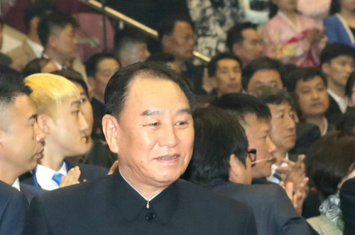 | 행사장 들어서는 김영철 김영철 조선노동당 중앙위 부위원장(당 통일전선부장)이 3일 평양 류경정주영체육관에서 열린 남북합동공연을 관람하기 위해 행사장에 들어서고 있다. 평양공연 사진공동취재단 |