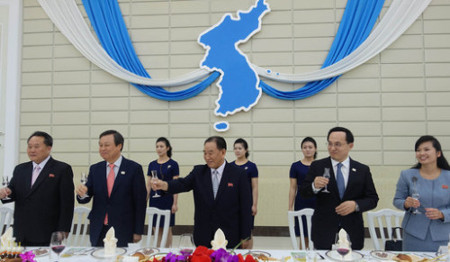 | 환송 만찬 주재하는 김영철 김영철 조선노동당 중앙위 부위원장(당 통일전선부장·앞줄 가운데)이 3일 통전부 소속 초대소인 미산각에서 우리 측 예술단을 위한 환송 만찬을 주재하며 건배를 제의하고 있다. 앞줄 왼쪽부터 리선권 조국평화통일위 위원장, 도종환 문화체육관광부 장관, 김 부위원장, 김상균 국가정보원 2차장, 현송월 삼지연관현악단장. 평양공연 사진공동취재단 |
