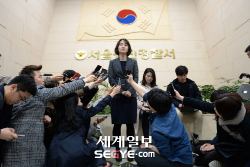성추행 의혹에 휩싸인 가수 김흥국이 5일 오후 서울 구의동 광진경찰서에 피의자 신분으로 출석한 가운데 피해자측 최다은 변호사가 인터뷰를 하고 있다.