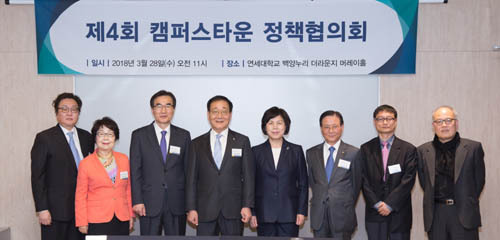 | 김용학(왼쪽 네 번째) 연세대학교 총장과 권기욱(오른쪽 두 번째) 서울시 도시계획국장 등이 지난달 28일 서울 서대문구 연세대학교에서 열린 ‘제4차 캠퍼스타운 정책협의회’를 마치고 기념촬영을 하고 있다. 서울시 제공 |