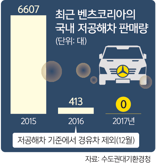 메르세데스벤츠코리아는 지난해 수입차로선 최초로 국내 판매량 6만대를 기록했다. 그런데 저공해차 판매량은 2015년 6607대에서 2016년 413대, 지난해 0대로 급감했다. 미세먼지가 심각한 문제로 부상하면서 2016년 12월 저공해차 종류에서 경유차가 완전히 빠지고 휘발유차의 배출기준도 강화된 결과다.