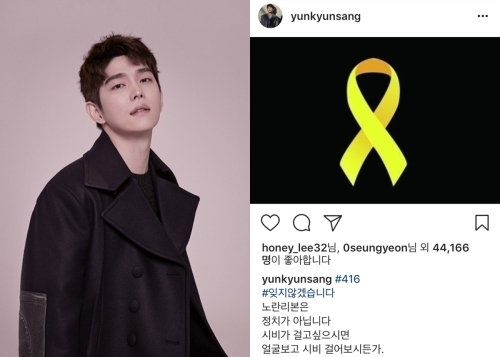 16일 윤균상은 자신의 인스타그램을 통해 "4·16 잊지 않겠습니다"라는 글과 함께 검은색 배경에 노란색 리본의 모습이 담긴 사진을 게재했다.