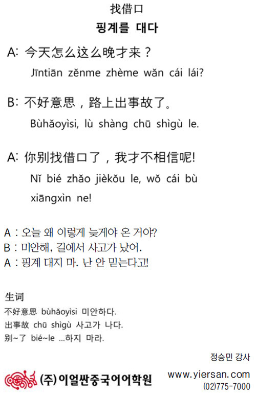 [이얼싼 중국어 회화] 핑계를 대다 입력 : 2018-04-18 21:01:37 수정 : 2018-04-18 21:01:49 구글 네이버 유튜브 Copyright ⓒ 세계일보. 무단 전재 및 재배포 금지 세계일보