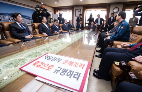 | 한국당, 서울경찰청 항의 방문 자유한국당 김성태 원내대표(왼쪽 두번째)를 비롯한 당 소속 의원들이 19일 오전 민주당원(필명 드루킹) 댓글조작 의혹 수사 관련 항의를 위해 서울지방경찰청을 방문해 이주민 청장(오른쪽)과 면담하고 있다. 하상윤 기자 |