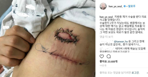 한예슬은 20일 자신의 인스타그램에 "지방종 제거 수술을 받다 의료사고를 당했다"는 내용의 글과 함께 수술 자국이 선명하게 남아 있는 신체 일부의 사진을 게재했다.