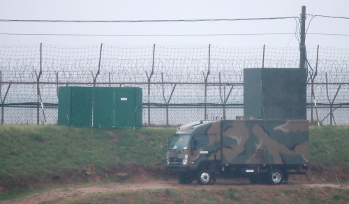| 우리 군이 군사분계선(MDL) 일대에서 시행한 대북 확성기 방송을 23일 0시부터 중단했다. 북한의 4차 핵실험에 맞서 2016년 1월 8일 군사분계선 일대에 설치된 대북 확성기 방송 시설을 가동한 지 2년 3개월여 만에 방송이 중단된 23일 경기도 파주 일대 철책 인근에서는 기동형 확성기 방송 차량이 운용을 멈춘 채 자리하고 있다. 연합뉴스 |
