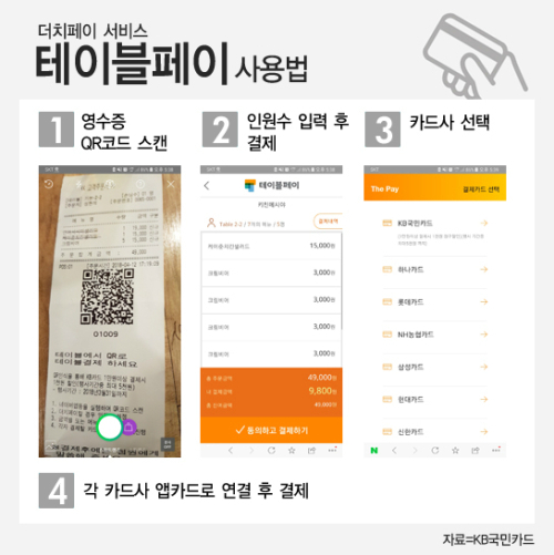 그렇다보니 모두가 같은 카드사의 카드를 써야 더치페이를 할 수 있었습니다. 하지만 7개 카드사가 존재하는 만큼 더치페이를 해야 하는 모두가 같은 카드일 확률은 극히 낮습니다. 그래서 KB국민카드는 테이블페이 서비스를 개방했습니다.  현대· 삼성· 롯데·하나카드 등 대부분의 카드사들이 여기에 동참했습니다