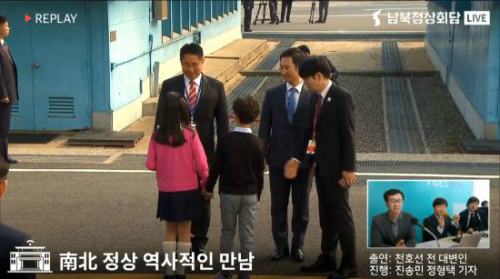 두 정상은 이날 오전 9시30분쯤 판문점 군사분계선에서 악수를 나눈 뒤 차도로 이동해 남녀 초등학생 2명으로부터 꽃다발을 전달 받은 뒤 이 화동들과 기념촬영(바로 아래 사진)을 했다.