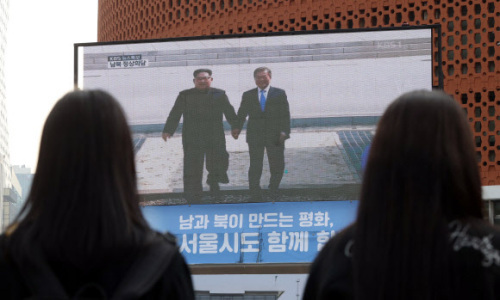 | 27일 오전 서울광장에 설치된 대형스크린 앞에서 시민들이 2018 남북정상회담 생중계를 지켜보고 있다. 뉴시스 |