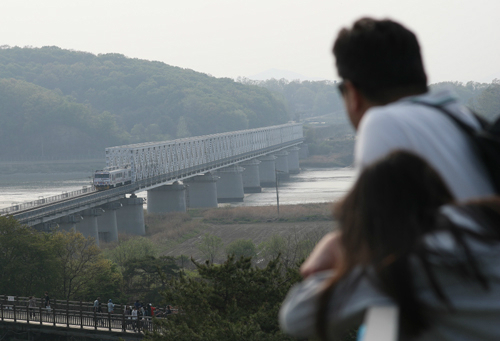 | 역사적인 2018 남북 정상회담의 감동이 채 가시지 않은 28일 오전 경기 파주시 임진각을 찾은 관광객들이 철도중단점 열차를 바라보고 있다. 문재인 대통령과 김정은 북한 국무위원장은 4.27 판문점 선언을 통해 완전한 한반도 비핵화와 동해선, 경의선 철도 연결 등을 합의했다. |