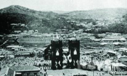| 1899년 9월 18일 경인선 개통장면. 일제는 1897년 미국으로부터 경인선 부설권을 사들여 경인선을 완공, 침탈한 우리의 물자를 실어나르는데 이용했다. 경인선 개통일인 9월 18일을 철도의 날인 것에 대해 일제 잔재라는 비판이 잇따르자 정부는 대한제국 철도국 창설인인 6월 28일로 변경해 기념키로 했다. |