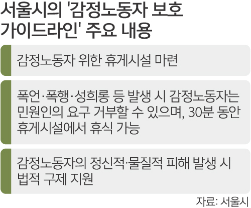 서울시는 시 본청과 사업소, 투자출연기관에서 일하는 감정노동자를 위해 지자체 최초로 ‘감정노동자 보호 가이드라인’을 만들었다고 9일 밝혔다.