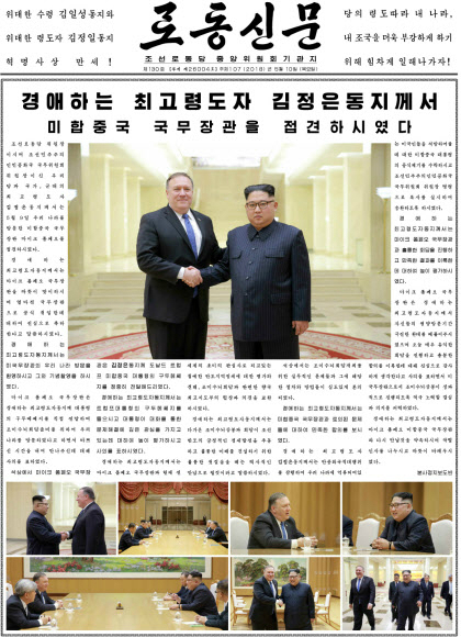 | 폼페이오 미국 국무장관과 김정은 국무위원장의 회동사실을 전한 10일자 북한 노동신문 1면. 연합뉴스 |
