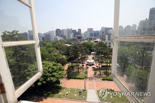 | 덕수궁 돌담길을 따라 걸으며 1900년대 초 근대 정동의 정취를 느낄 수 있는 역사·문화축제 `정동야행` 개막을 하루 앞둔 10일 오후 언론에 공개된 서울 중구 구러시아공사관 내부에서 바라본 서울 풍경. |