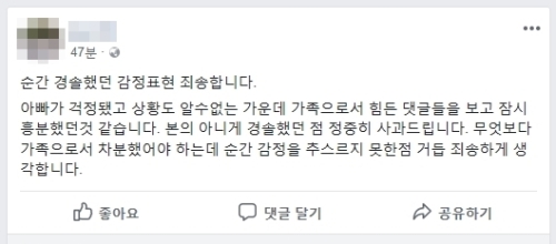 그는 "아빠가 걱정됐고 상황도 알 수 없는 가운데 가족으로서 힘든 댓글들을 보고 잠시 흥분했던 것 같다"며 "본의 아니게 경솔했던 점 정중히 사과린다. 무엇보다 가족으로서 차분했어야 하는데 순간 감정을 추스르지 못한 점 거듭 죄송하게 생각한다"고 사과했다.