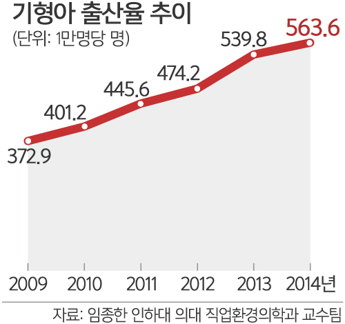 임종한 인하대 의대 직업환경의학과 교수팀은 2008∼2014년 출생한 320만8617명의 건강보험 청구 자료를 분석한 결과 2008년 100명당 3.4명이던 기형아 출산이 2014년 5.6명으로 늘었다고 23일 밝혔다.
