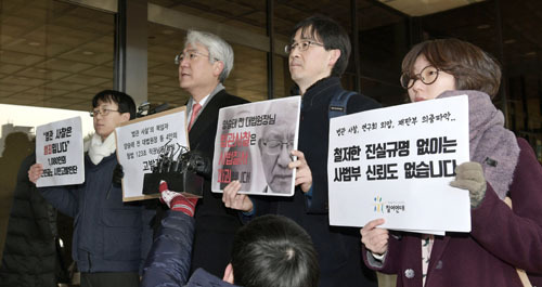 참여연대 사법감시센터와 `천인공노 시민고발단`이 지난 1월 29일 양승태 전 대법원장 등 4인에 대한 직권남용 권리행사방해 혐의 고발장을 접수하기 위해 서울 서초구 서울중앙지검에 들어서면서 취재진의 질문에 답변하고 있다. 세계일보 자료사진