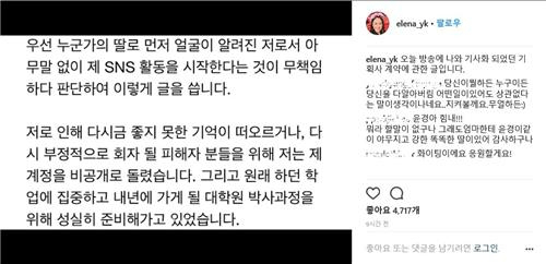 윤경 씨는 이날 인스타그램에 올린 글에서 "(그동안) 저로 인해 다시금 좋지 못한 기억이 떠오르거나, 다시 부정적으로 회자할 피해자들을 위해 제 계정을 비공개로 돌렸다. 그리고 원래 하던 학업에 집중하고 내년에 가게 될 대학원 박사과정을 위해 성실히 준비해가고 있었다"고 말했다.