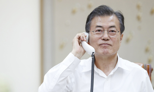 | 문재인 대통령이 12일 청와대 관저에서 도널드 트럼프 미국 대통령과 통화하며 북미 정상회담 결과를 논의하고 있다. 뉴시스 |