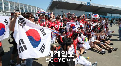 [러시아월드컵] '대한민국 화이팅!' 입력 : 2018-06-18 19:37:15 수정 : 2018-06-18 19:37:14 구글 네이버 유튜브 대한민국 응원단이 18일(현지시간) 니즈니노브고로드 스타디움에서 열린 '2018 러시아 월드컵 F조 예선 1차전' 스웨덴과의 경기에 앞서 응원전을 펼치고 있다. 사진=니노브고로드(러시아), 스포츠월드 김용학 기자 Copyright ⓒ 세계일보. 무단 전재 및 재배포 금지 세계닷컴 한윤종