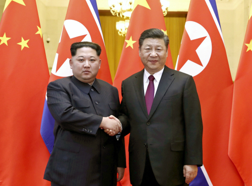 | 김정은 북한 조선노동당 위원장(왼쪽)과 시진핑 중국 국가주석이 지난 3월 28일 북·중 정상회담에 앞서 악수하고 있다. AP연합뉴스 자료사진 |