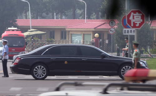 | 김정은 북한 국무위원장이 19일 세번째 중국 방문에 나선 가운데 이날 오전 중국 베이징 서우두 공항 국빈터미널에서 북한 고위급 전용차량으로 보이는 차량이 공항을 빠져나가고 있다. 이날 북한 차량 행렬에는 김 위원장의 마크로 추정되는 금색 휘장이 새겨진 차량 두 대가 포착됐다. 사진은 김 위원장의 전용차량 외에 금색 휘장이 새겨진 또다른 차량의 모습. 연합뉴스 |
