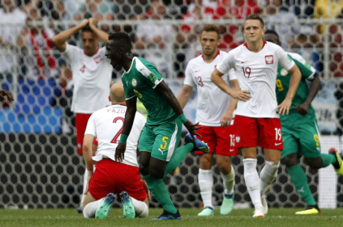 | '손님 실수가 더 기쁘게 마련' 20일 새벽에 열린 2018러시아월드컵 H조 1차전에서 전반 37분 세네갈의 게예(5번)가 슈팅한 볼이 폴란드 수비스 시오넥(왼쪽 뒤 5번) 발맞고 그대로 골인되자 게예가 기쁨을 감추지 못하고 있는 반면 시오넥은 머리를 감싸쥐며 괴로워하고 있다. 이 경기서 폴란드는 1-2로 패하고 말았다.모스크바=AP 뉴시스 |