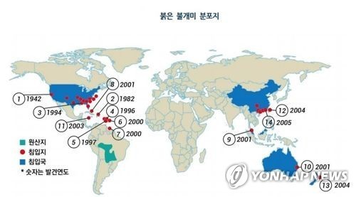 2001년부터는 호주, 뉴질랜드, 대만, 말레이시아, 중국 등 아시아권으로까지 확산했다. 한국해양수산개발원은 이미 붉은불개미가 정착한 국가가 14개에 이른다고 21일 밝혔다.