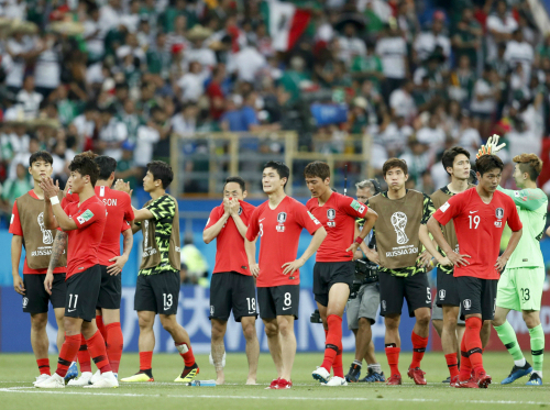 | 멕시코전에서 진 한국축구대표 선수들이 그라운드 위에서 아쉬워하는 모습. |