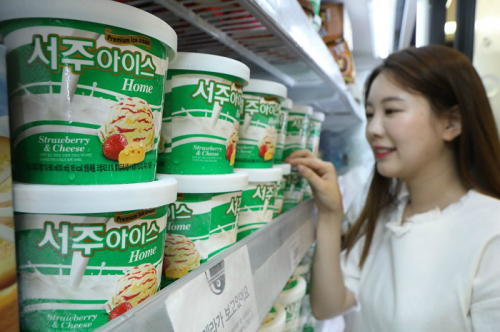 롯데마트가 45년 전통 ‘서주아이스바’를 홈 아이스크림으로 단독 출시하며 아이스크림 시장의 복고 열풍을 이어간다. ‘서주아이스바’는 1973년 서주산업의 아이스크림 제조업체인 ㈜서주에서 출시한 덴마크식 고급 아이스크림을 표방한 제품이며, 내용물이 없는 단순한 우유 맛과 복고풍의 포장으로 45년이 지난 지금까지 인기를 누리고 있다. 26일 오전, 롯데마트 서울역점에서 고객이 ‘서주아이스 홈 아이스크림’ 상품을 둘러보고 있다. 롯데마트 제공.